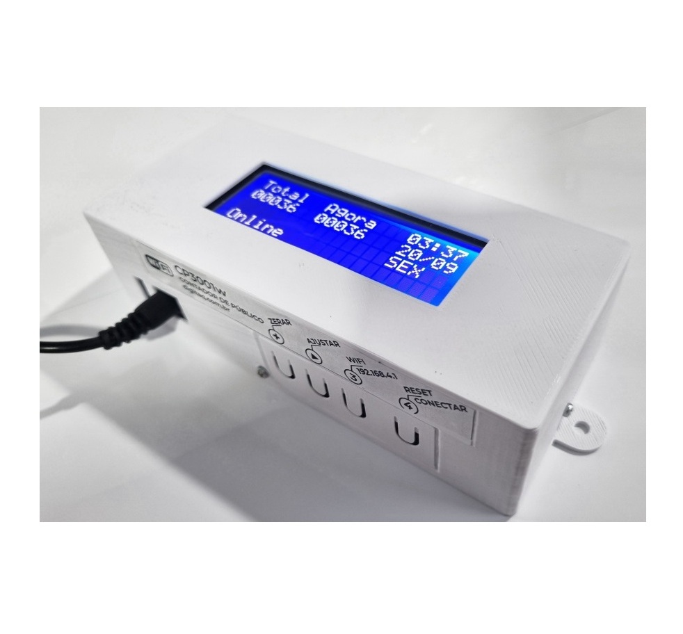 Conecte a fonte na tomada (110V ou 220V – é bivolt automático) e aguarde a inicialização. O visor azul será ativado e mostrará as contagens, data e hora.