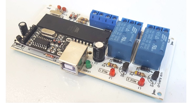Placa para automação com 2 relés. Permite controlar cargas de alta potência em horários definidos pelo computrador. Além disso você pode utilizar o software USB 4 Relay Manager para criar sequencias de processos de automação.