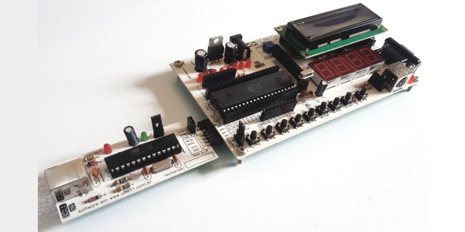 KIT de desenvolvimento e estudo do microcontrolador 8051 baseado no AT89S52. Gravação via porta USB.